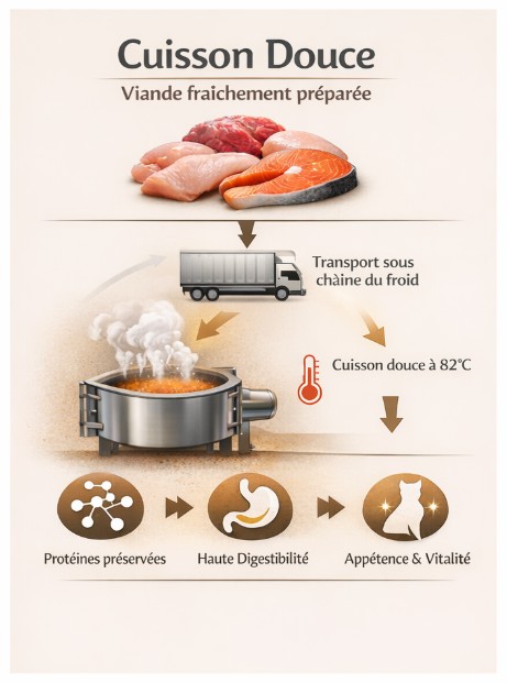 De la sélection rigoureuse des ingrédients jusqu’à la cuisson douce, chaque étape est pensée pour préserver l’intégrité des protéines, optimiser la biodisponibilité des nutriments et garantir une digestibilité optimale.