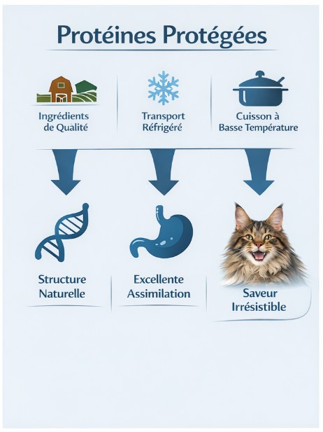 qualité des matières premières, respect des protéines, digestibilité optimale.