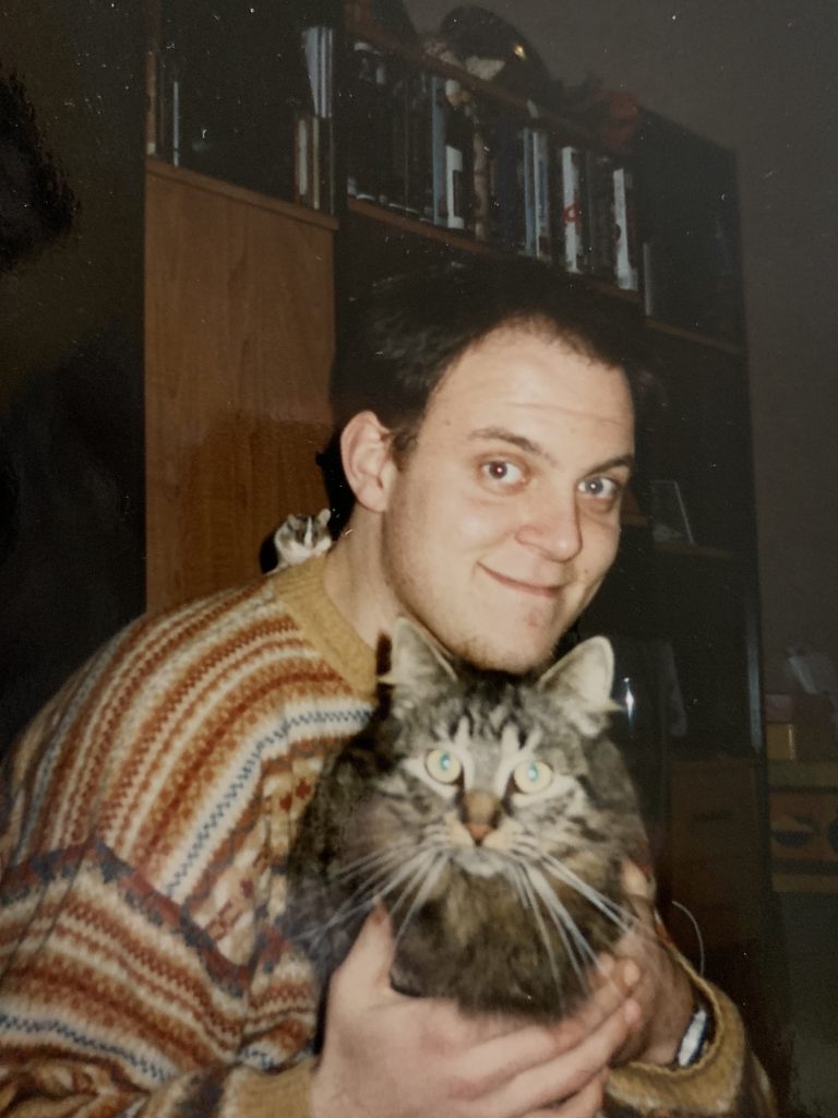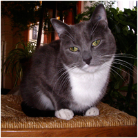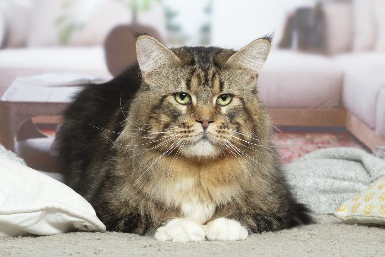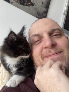 À la suite du décès de notre chat de maison : Minouche, Christophe s’est mis en quête d’un compagnon qui lui rappellerait sa première protégée, Câline, une chatte de type Maine Coon au pelage brown blotched tabby.
